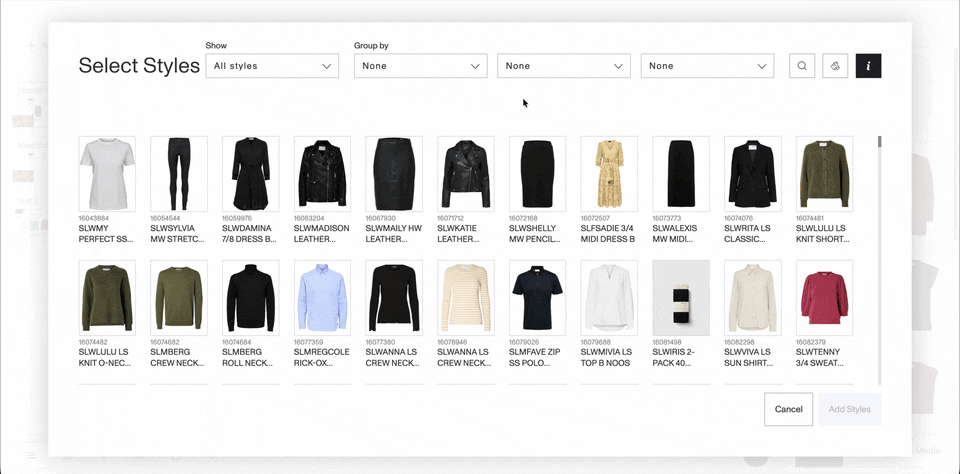 “Add Styles” modal in Moodboards page: 3-level grouping
